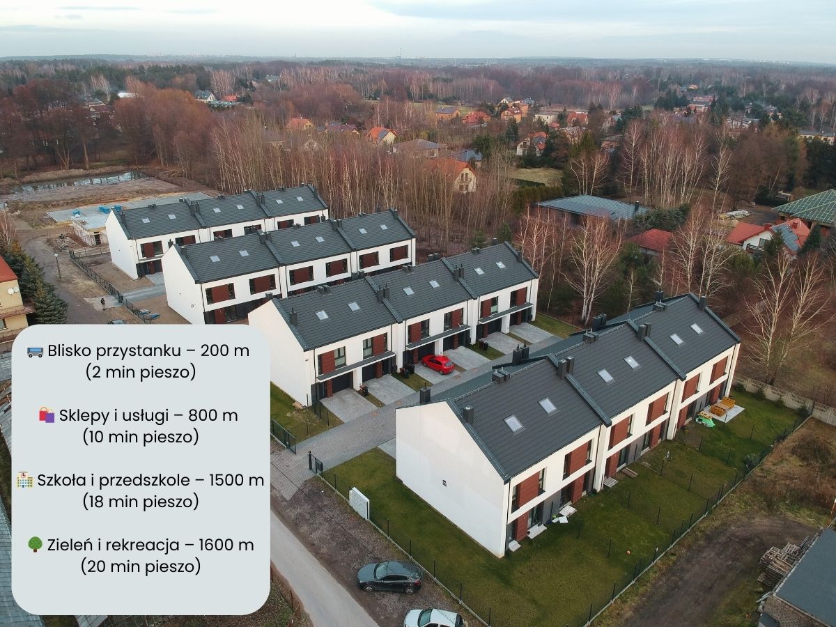 Położenie inwestycji gwarantuje mieszkańcom komfort każdego dnia. Zaledwie 800 metrów od osiedla znajduje się kompleks handlowy z takimi sklepami jak: Lidl, Biedronka, CCC, Pepco, Kik czy Rossmann, więc bardzo wygodnie można zrobić małe i duże zakupy. Do najbliższego żłobka, przedszkola oraz szkoły podstawowej dojeżdża się samochodem lub autobusem w ok. 5 min – w słoneczne dni swoje pociechy można do tych placówek odprowadzać pieszo.rozwiń ∨